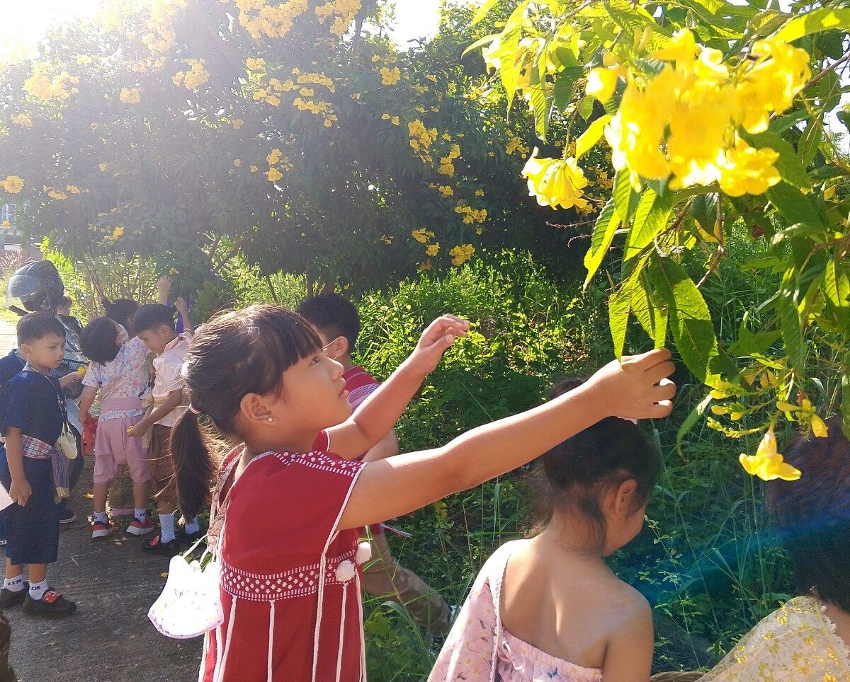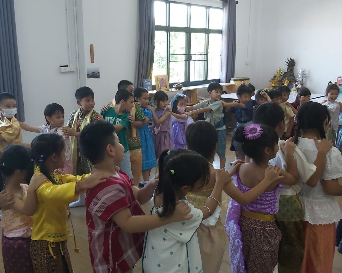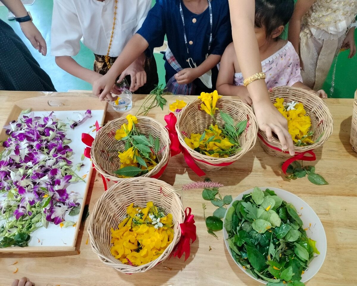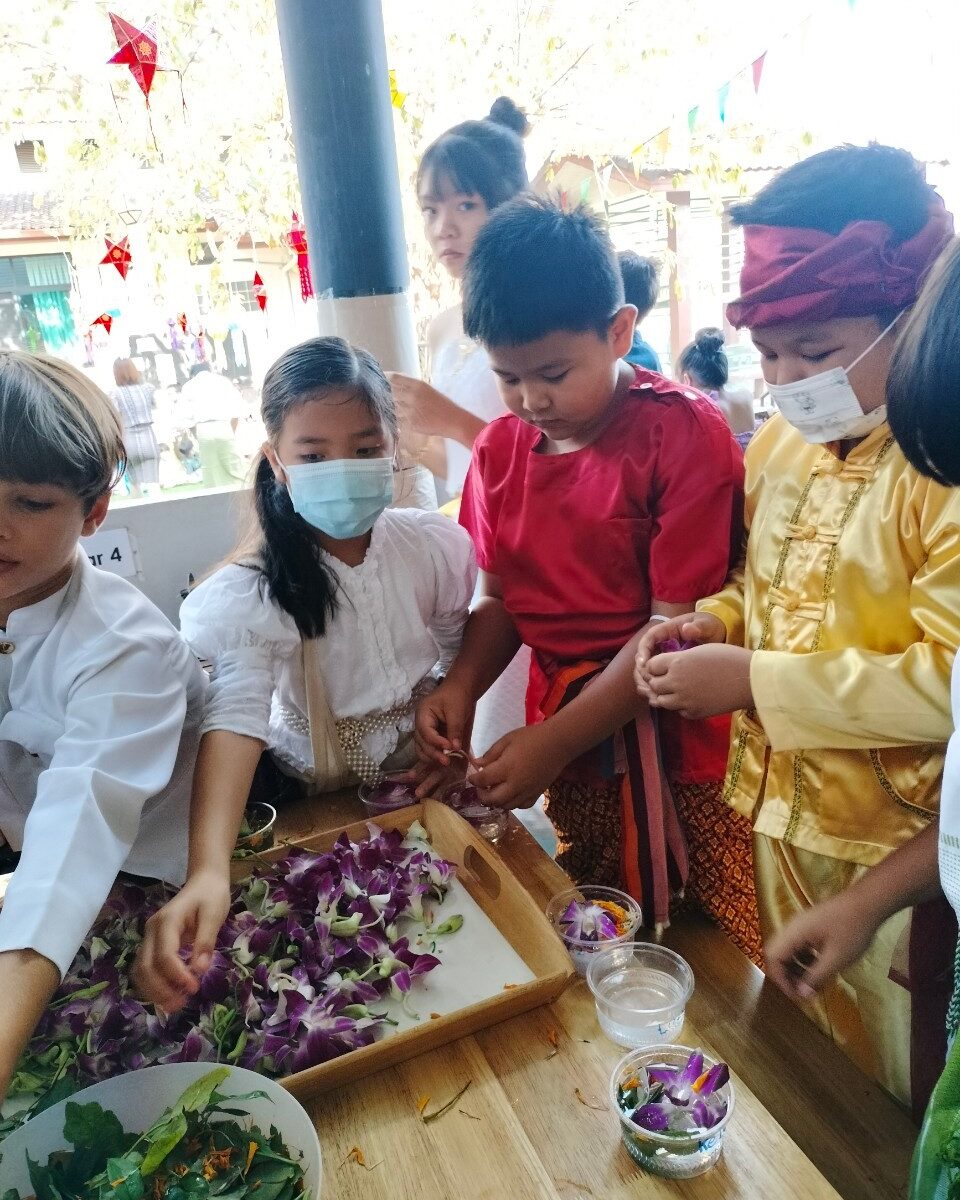 Separated into two teams, one team worked on gathering flowers and the other team worked on preparing the collected flowers & leaves for designing their Krathongs. Once the preparations were ready, the students filled cups with water, the prepared flowers & leaves and then froze the cups to create their own ice Krathongs. Upon completion, all the students gathered up to enjoy a traditional dance by the invited guest performer before joining in all together for a traditional dance at the end.