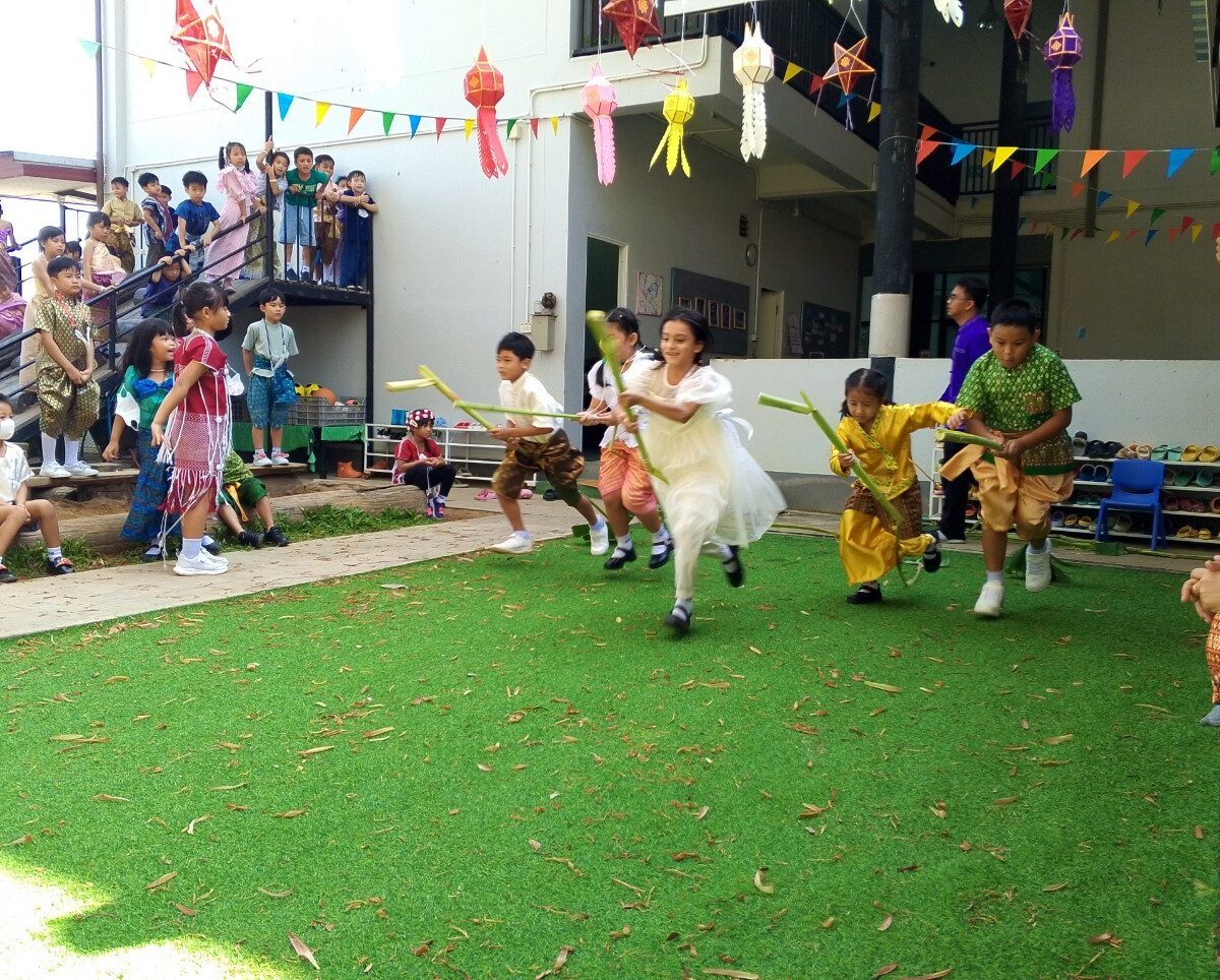 Next on the list of activities, the preschool students grilled slices of bananas for all the students to enjoy as snacks during the event. While the preschool students were occupied with making grilled bananas, the primary students participated in traditional games such as Banana Horse Game, Ree Ree Khao San & Mon San Pha. During the afternoon, before heading back home, the students got to float their Ice Krathongs that they have created in the morning in the garden.